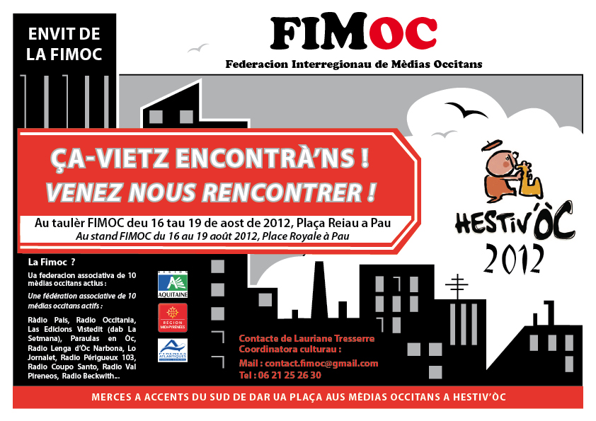 Los mèdias de la Fimòc que son a la vòsta disposicion suu baloard deu Pirenèus a Pau deu dijaus 16 tau dimenge 19 d’aost au parat d’Hestiv’òc. Lo site public de la Fimòc qu’ei ua veirina : un site reservat Palanca qu’ei a disposicion deus membres federats tà depausar o préner subjèctes en occitan.