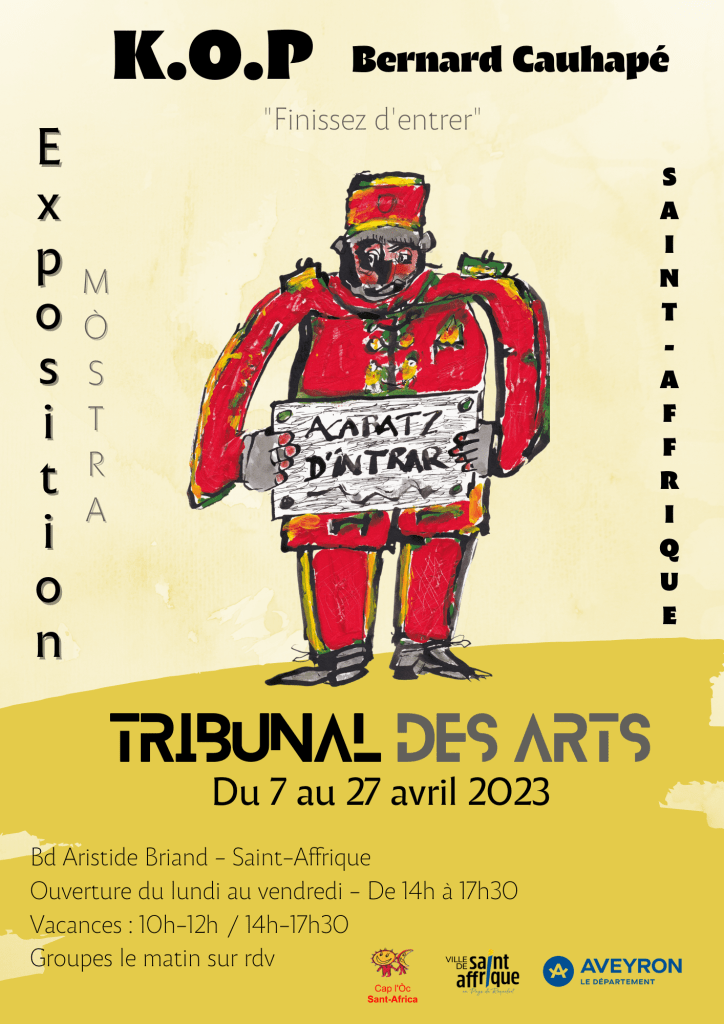 Mentre lo maire de Rodés e tempta de massacrar l’Estivada. La mustra de Bernat Cauhapè K.O.P., un deus actors de la quita Estivada longs ans de reng, Acabatz d’entrar que serà inaugurada en preséncia de las autoritats deu departament d’Avairon, lo divés 7 d’abriu a 6 h deu vrèspe au tribunau de las arts 8 baloard Aristide Briand a Sent-Africa. Vedederas dinc au 27 d’abriu, las òbras d’un uelh, d’ua pensada e de mans singularas. De non pas mancar. Inauguracion seguida d’ua performància deu quite actor e pintor-plastician a la sala de las Colonas sala de las hèstas de Sent-Africa. Rensenhament mailto:patrick.couffin@wanadoo.fr president de l’associacion Cap l’òc.